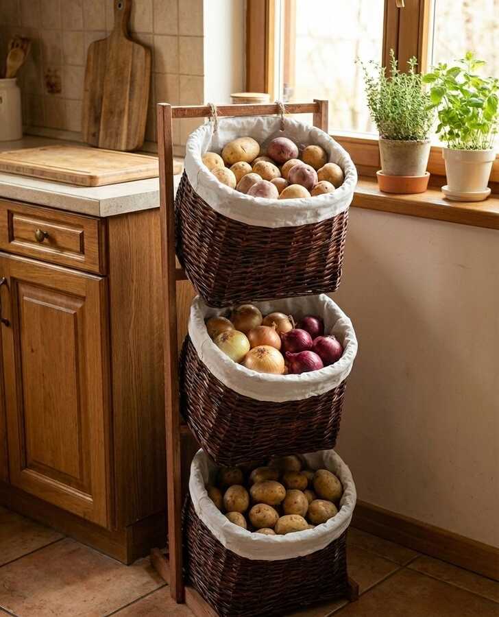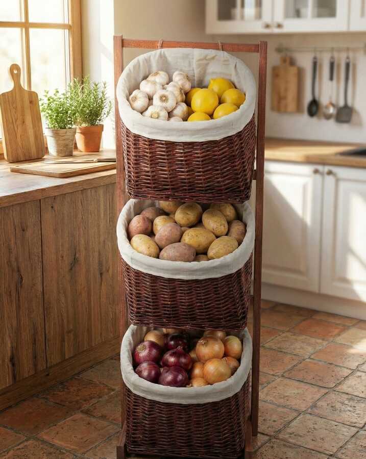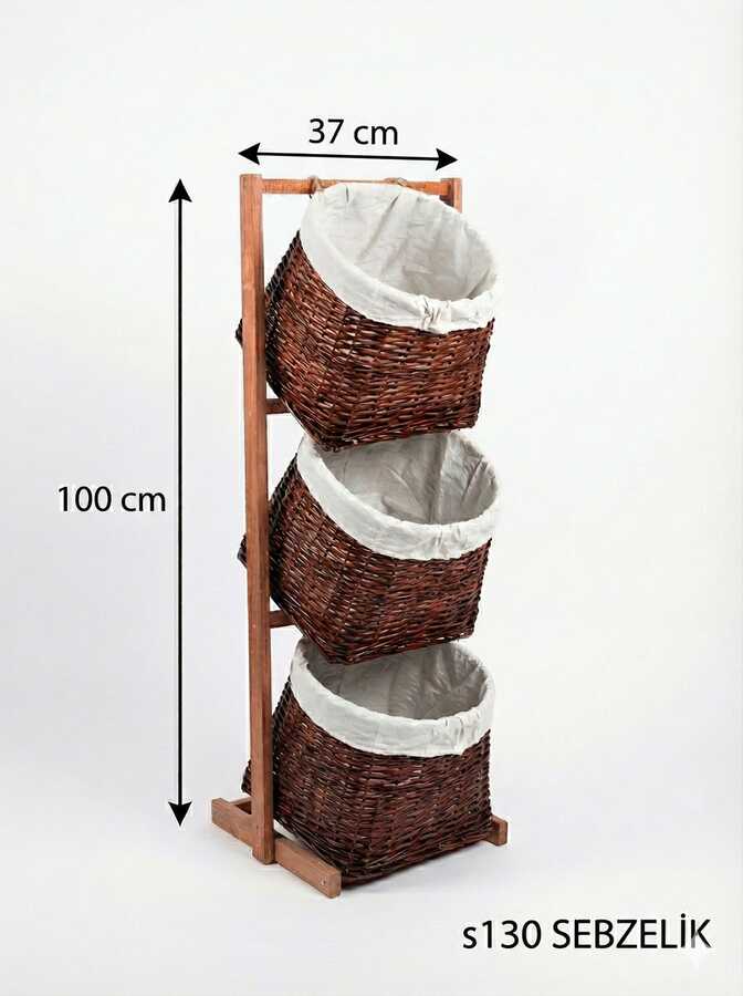 Ebat Bilgisi: 100x37 Cm. Üç katlı tasarımı ile hem sebzelerinizi hem de meyvelerinizi ayrı ayrı saklayarak taze kalmalarını sağlar. - Doğal hasır malzemesi sayesinde mutfak dekorasyonunuza rustik bir dokunuş katar. - Kolay temizlenebilir yapısı ile pratik kullanım sunar ve hijyenik bir ortam oluşturur. - Hafif ve taşınabilir yapısıyla istediğiniz yere rahatça taşıyabilirsiniz; mutfakta, balkonda veya bahçede kullanabilirsiniz.