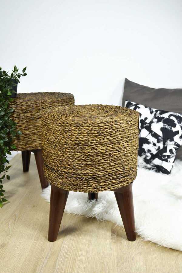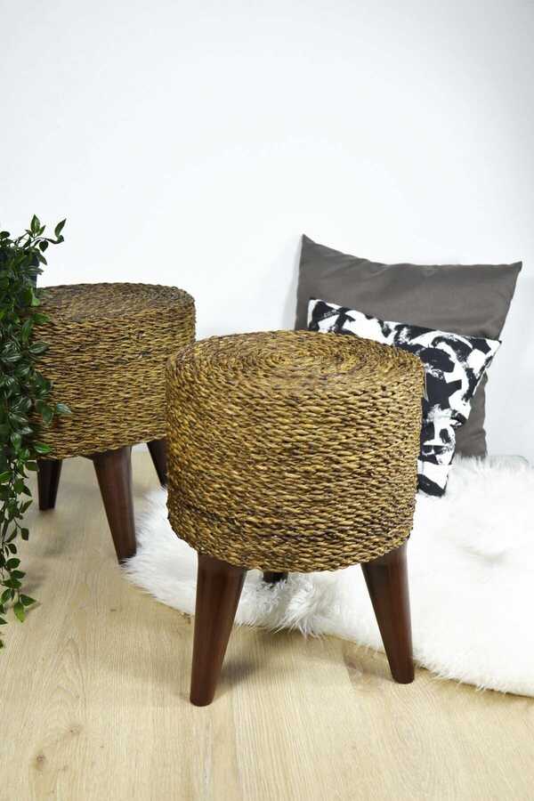 Hasır Puf Ayaklı Ahşap Yuvarlak