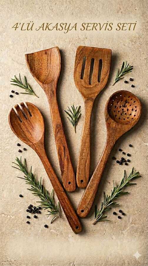 Akasya Ağacı 4 Parça Servis Kaşık Seti – 35 cm